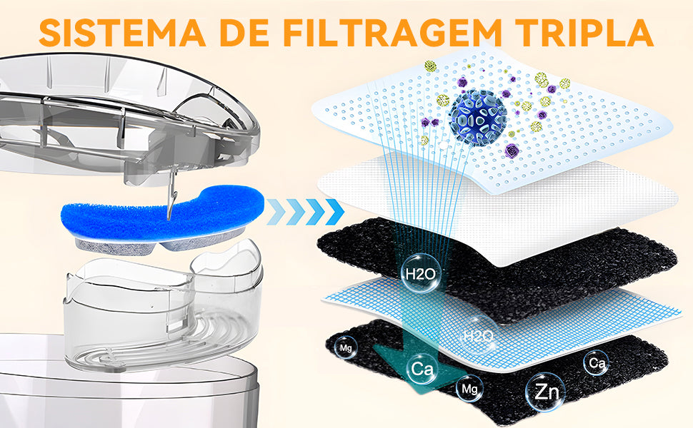 Mais que água filtrada: água nutritiva! O sistema de filtragem tripla elimina sujeiras e mantém minerais benéficos como H₂O, Zn, Ca e Mg, essenciais para a saúde do seu pet.