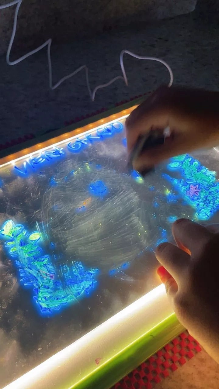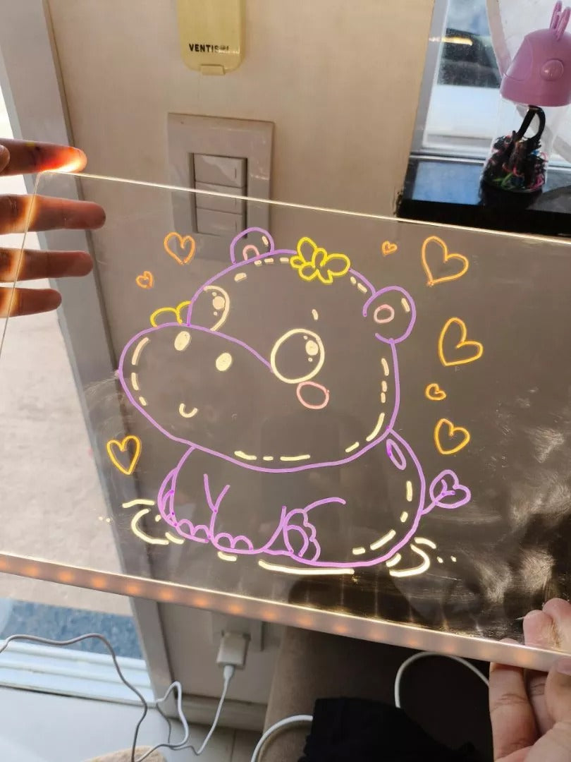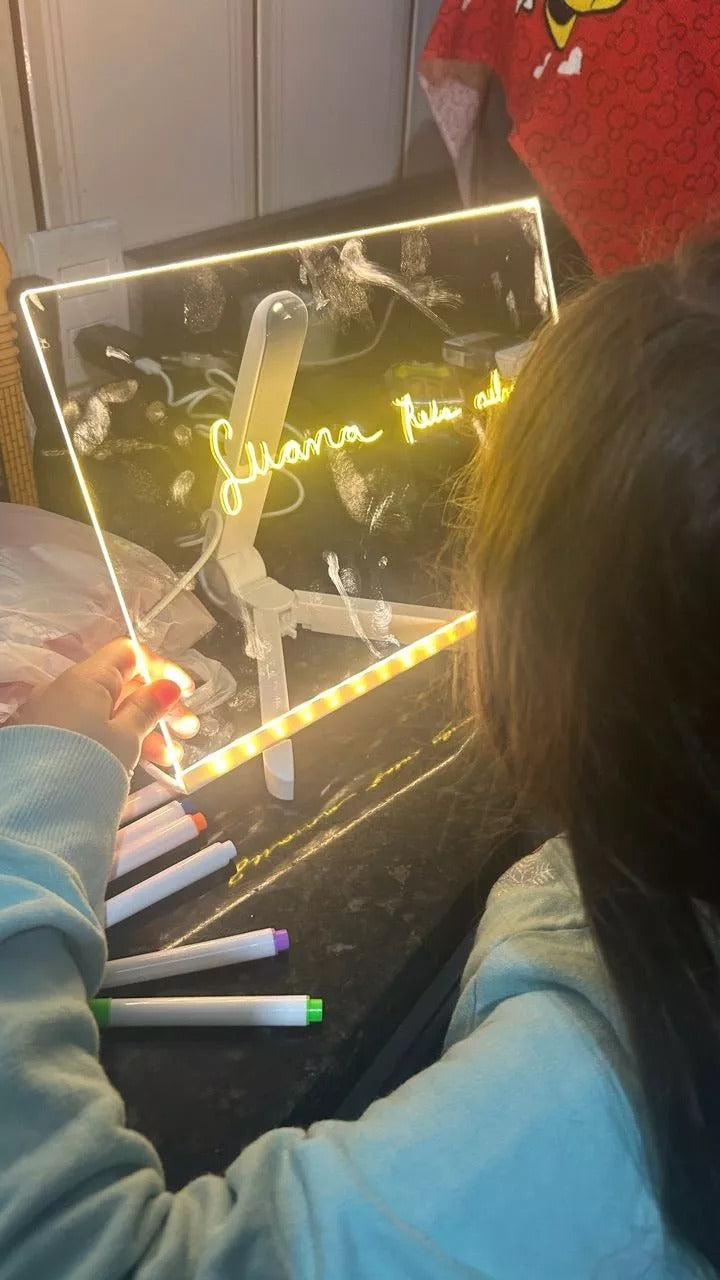 Ela usa canetas apagáveis para criar desenhos que brilham com luz LED, facilitando a criação e limpeza.